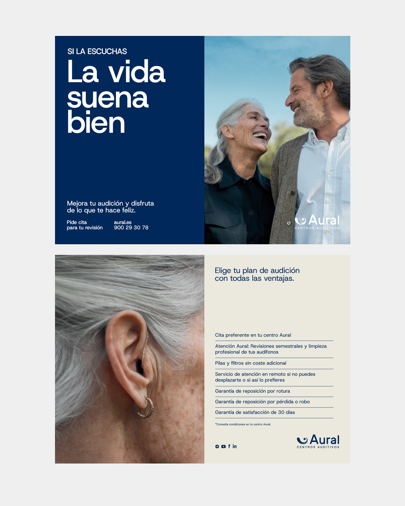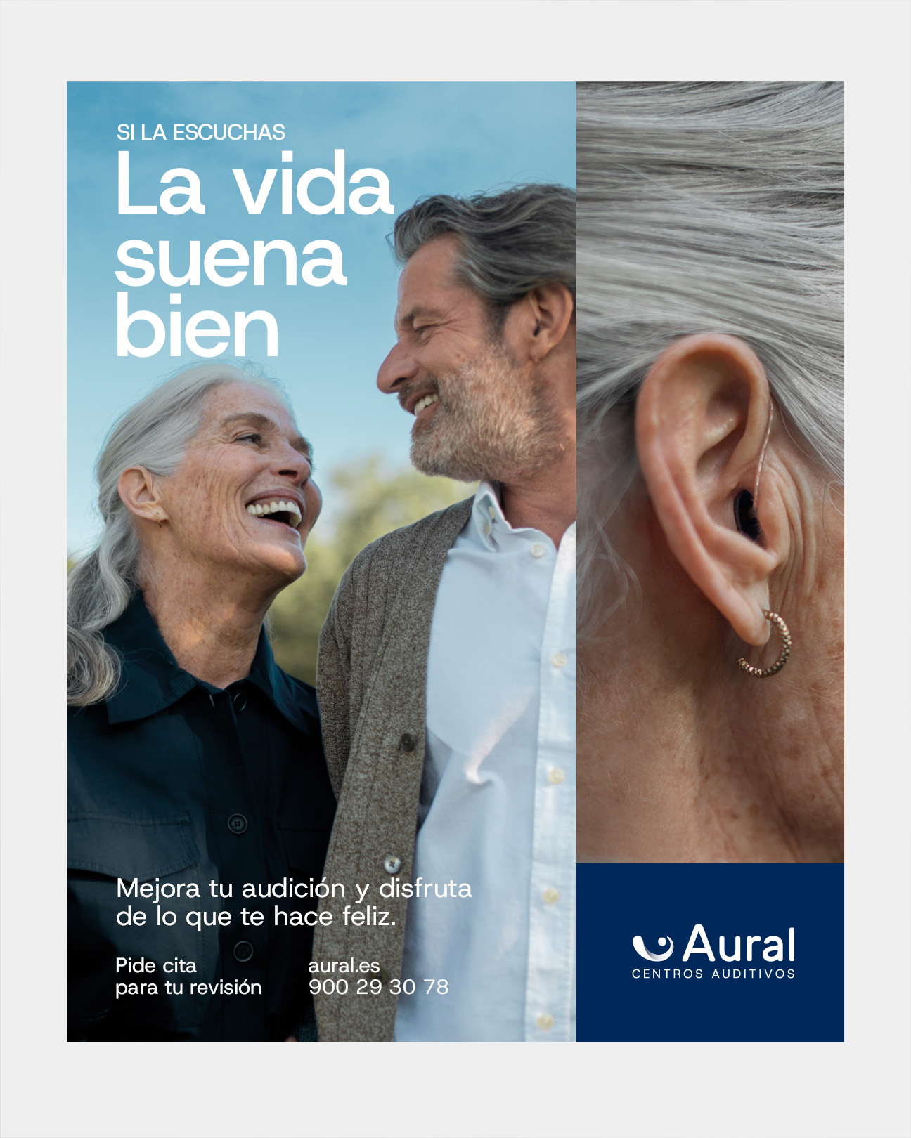«Suena bien» es una plataforma de marca con un código propio que diferencia al sector, generando un ambiente positivo y activo, dotando a la comunicación de aspiraciones y posicionando a Aural como una marca que comprende las necesidades de su público objetivo y les ofrece soluciones auditivas para que puedan seguir disfrutando de la vida sin complejos ni estigmas. Porque, si la escuchas, la vida suena bien.